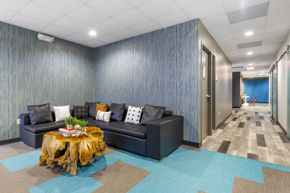Interior office includes shared waiting areas, conference rooms, huddle rooms, lounge, coffee bar, and WiFi.