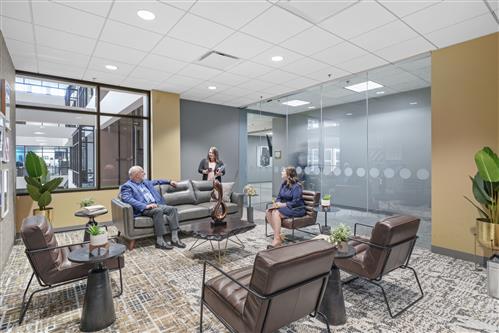 Private reception area and interior office. Includes shared conference rooms, huddle rooms, lounge, coffee bar, and WiFi.