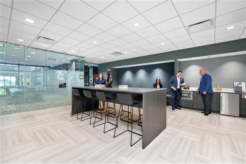 Interior office includes shared waiting areas, conference rooms, huddle rooms, lounge, coffee bar, and WiFi.