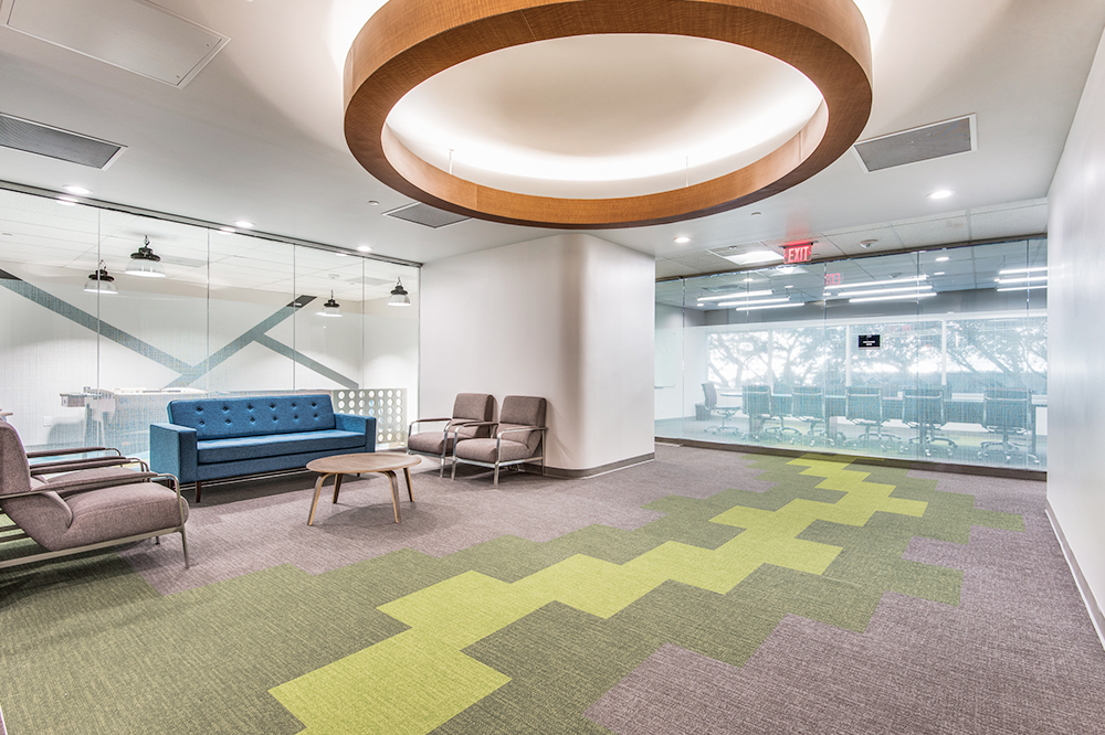 Interior office includes shared waiting areas, conference rooms, huddle rooms, lounge, coffee bar, and WiFi.