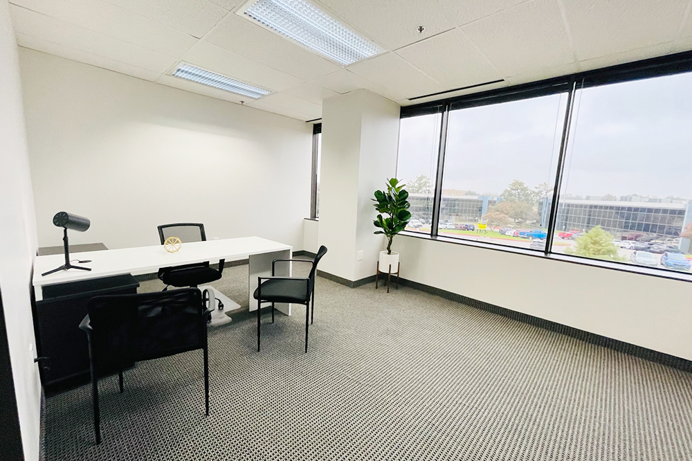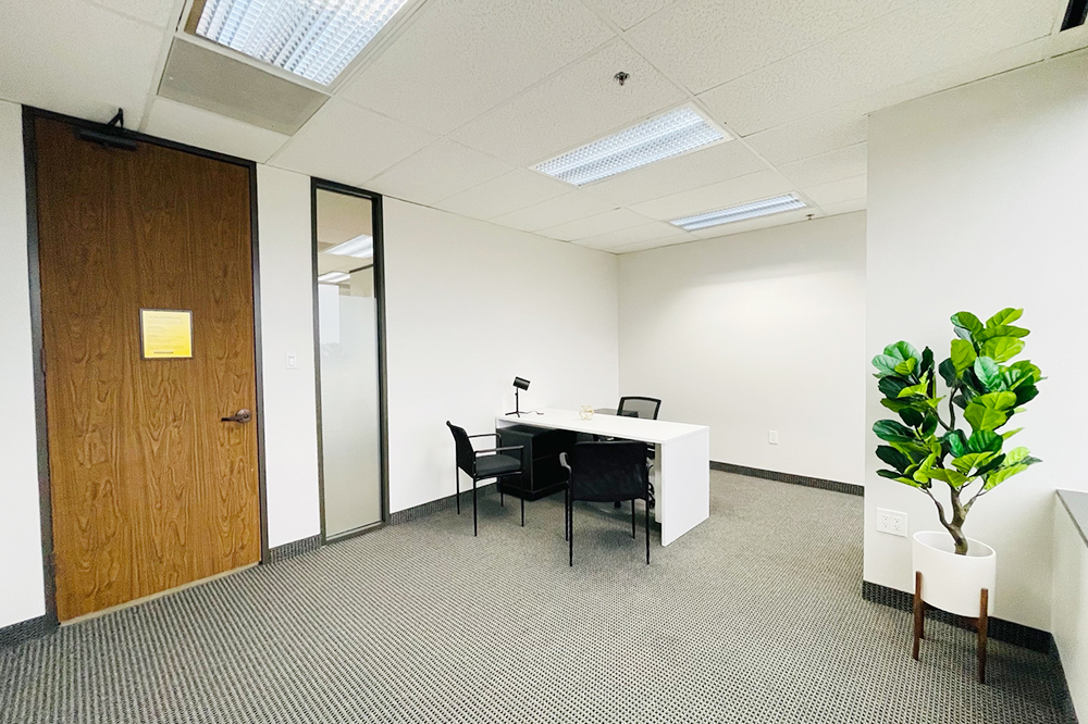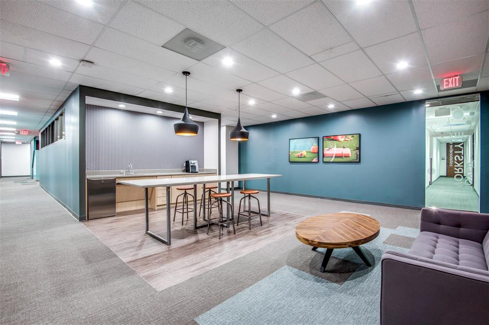 Private reception area and 3 window office, Open Area. Includes shared conference rooms, huddle rooms, lounge, coffee bar, and WiFi.