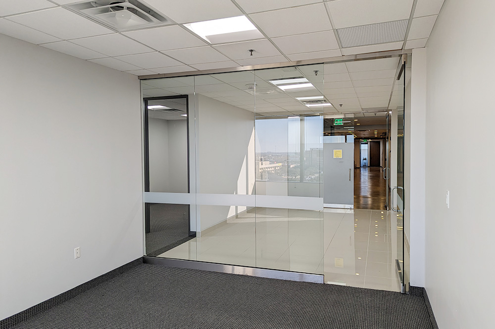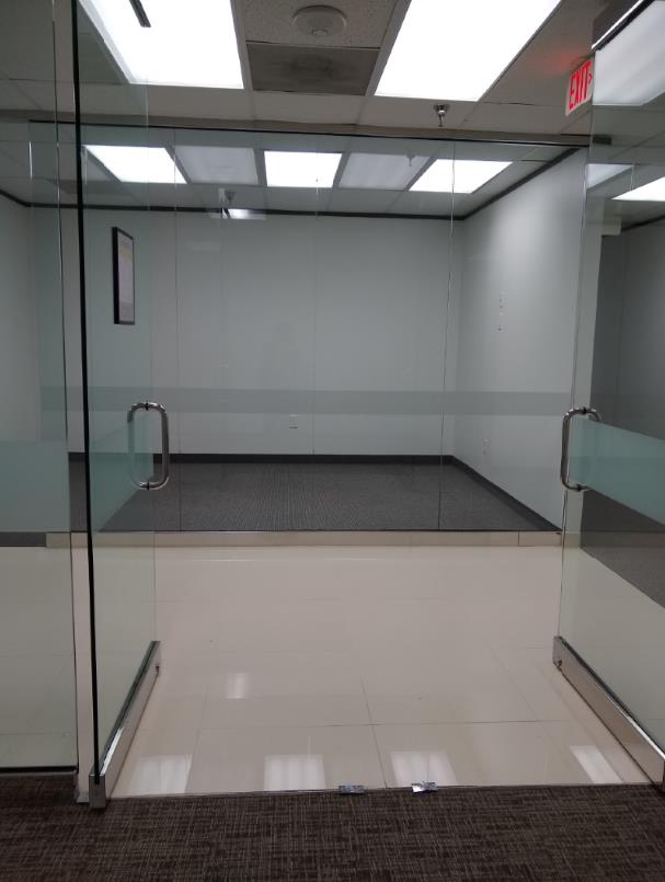 Glass Herculite Door with Tile Entry, 4 Window Offices, 1 bullpen.