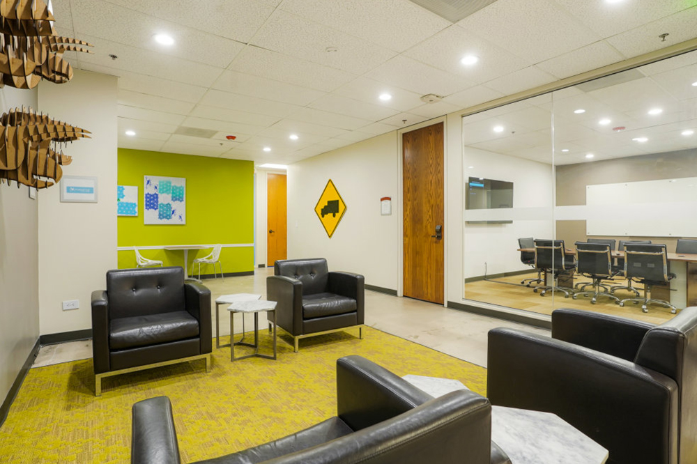 Interior office includes shared waiting areas, conference rooms, huddle rooms, lounge, coffee bar, and WiFi.