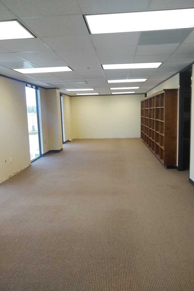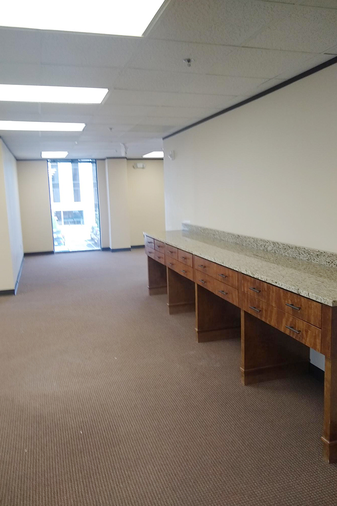 Reception area with built in desk, 2 window offices, conference room, breakroom and storage room