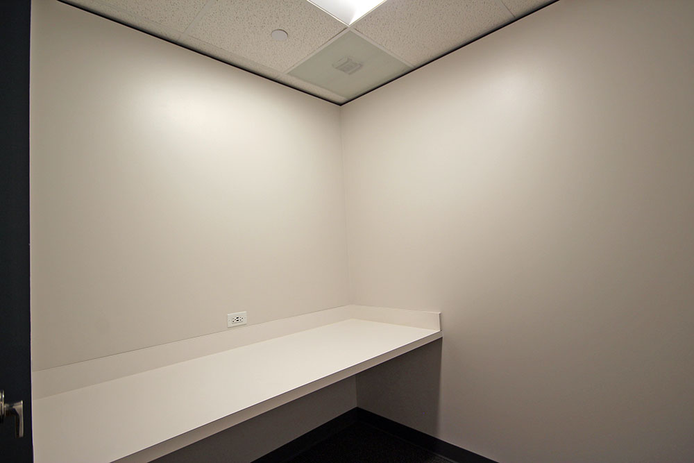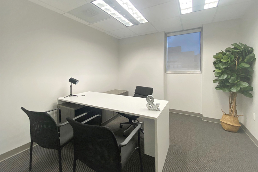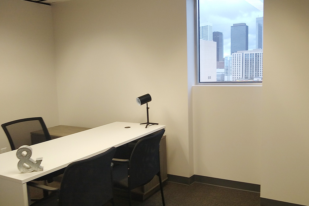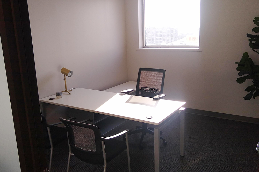Furnished interior office for 1 with built-in desk & executive chair. Includes shared waiting areas, conference rooms, huddle rooms, lounge, coffee bar, and WiFi.