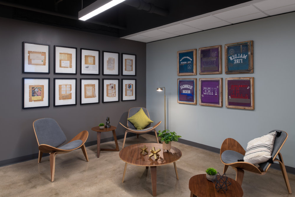 Interior office includes shared waiting areas, conference rooms, huddle rooms, lounge, coffee bar, and WiFi.