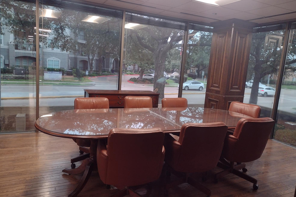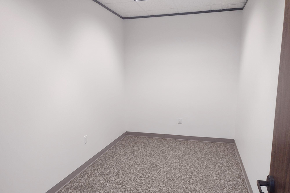Reception area with built in desk, 2 window offices, conference room, breakroom and storage room