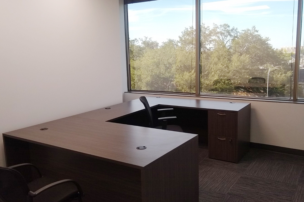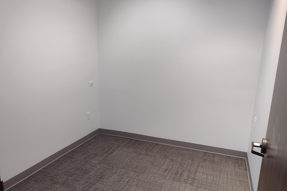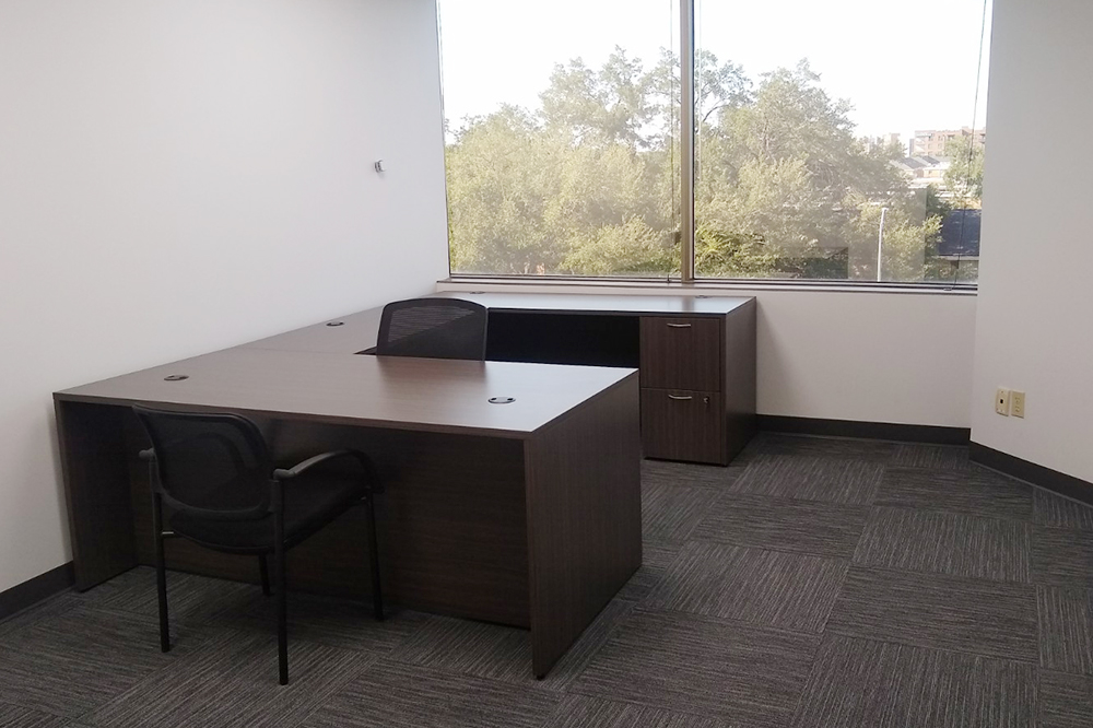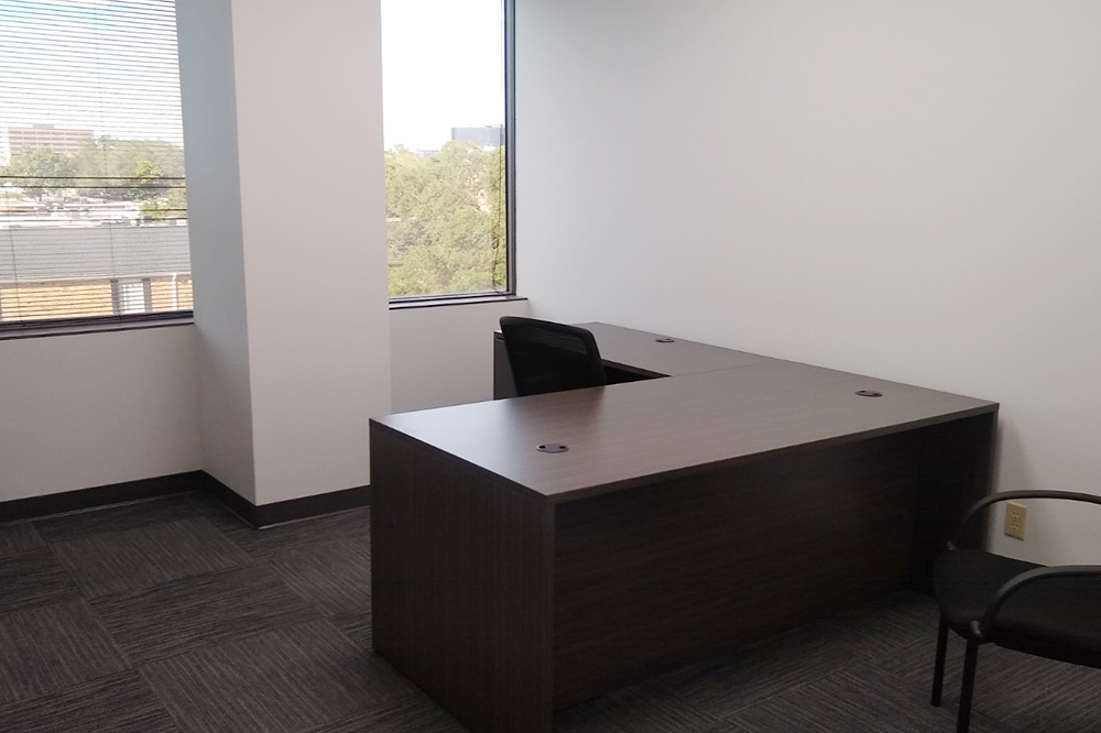 Interior office for 1 with built-in desk. Includes shared waiting areas, conference rooms, huddle rooms, lounge, coffee bar, and WiFi