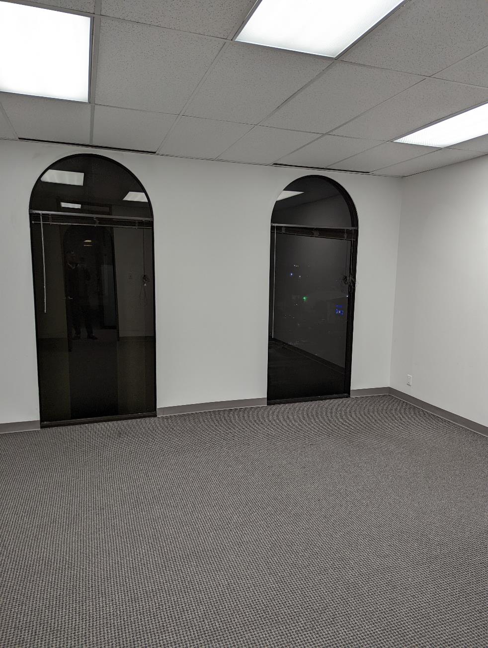 Large window office with 2 large glass doors, and storage room.