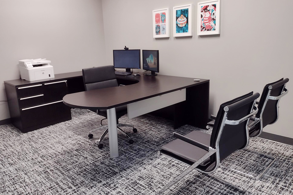 Furnished interior office for 1 with built-in desk & executive chair. Includes shared waiting areas, conference rooms, huddle rooms, lounge, coffee bar, and WiFi.