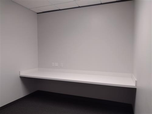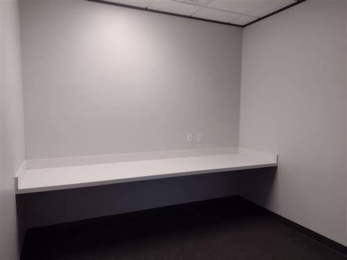 Interior office includes shared waiting areas, conference rooms, huddle rooms, lounge, coffee bar, and WiFi. Features a built in Desk located near outlet.