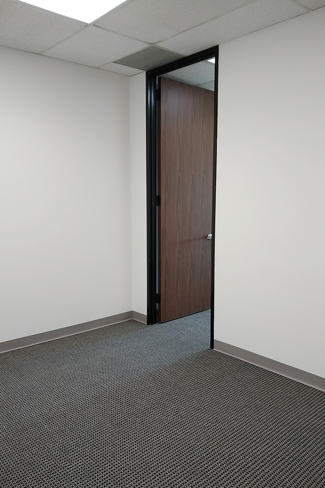 Reception area with built in desk, 2 window offices, conference room, breakroom and storage room