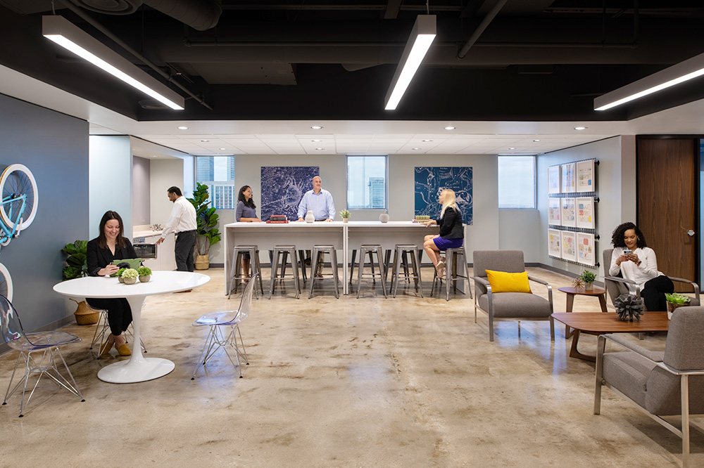 Interior office includes shared waiting areas, conference rooms, huddle rooms, lounge, coffee bar, and WiFi.