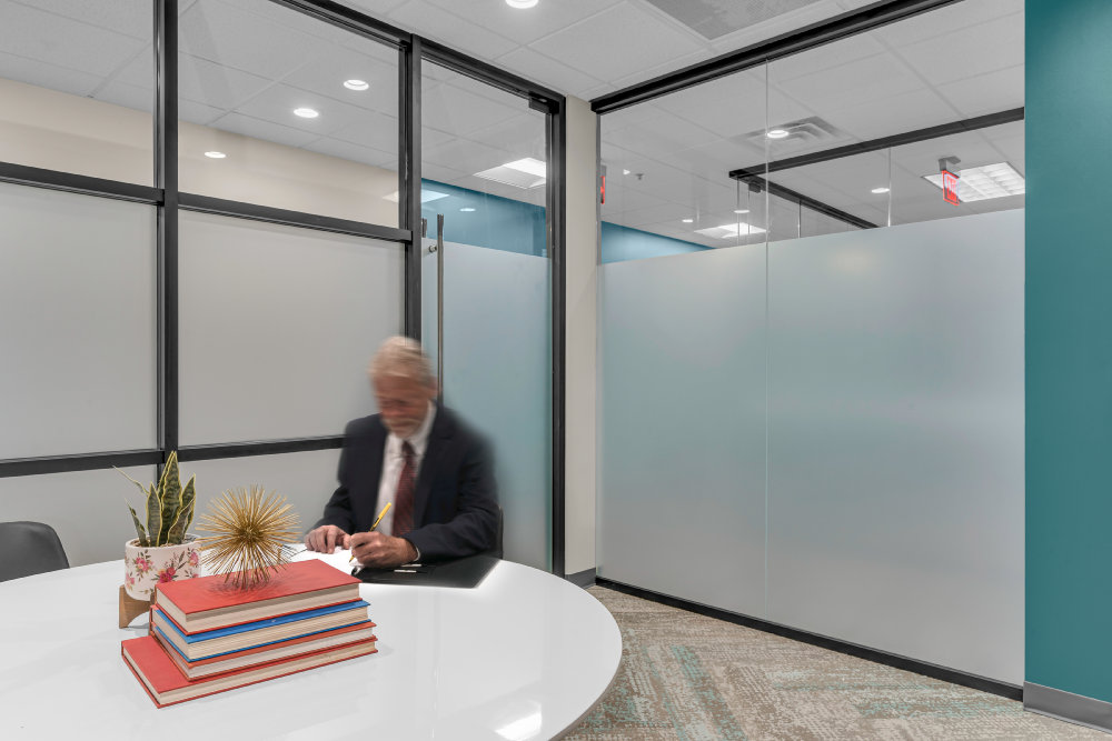 Interior office for 1. Includes shared waiting areas, conference rooms, huddle rooms, lounge, coffee bar, and WiFi.